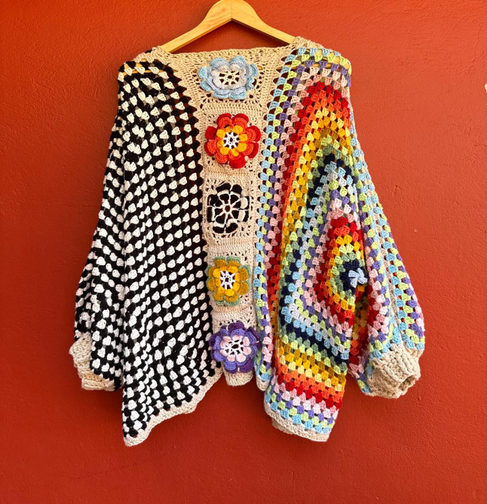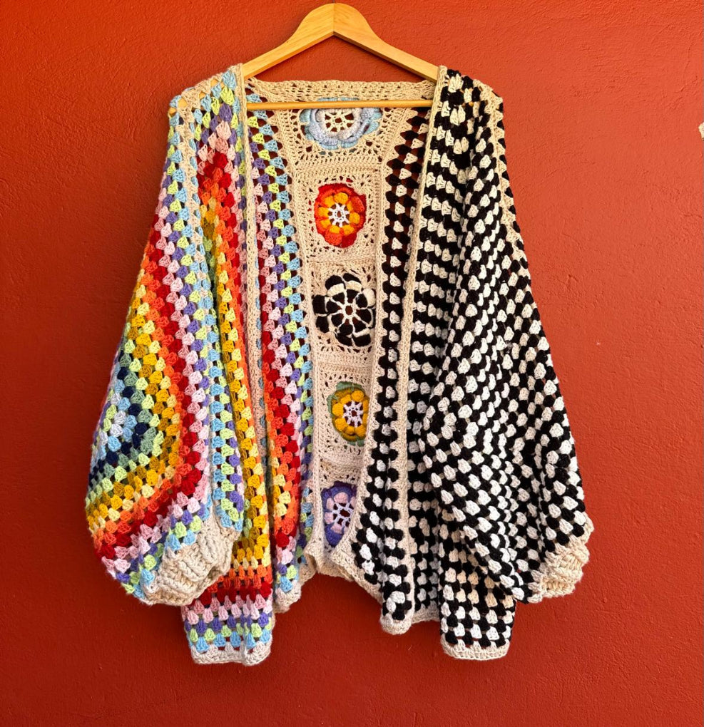 Una pieza tejida a mano que celebra el color, el contraste y la libertad de crear sin reglas.